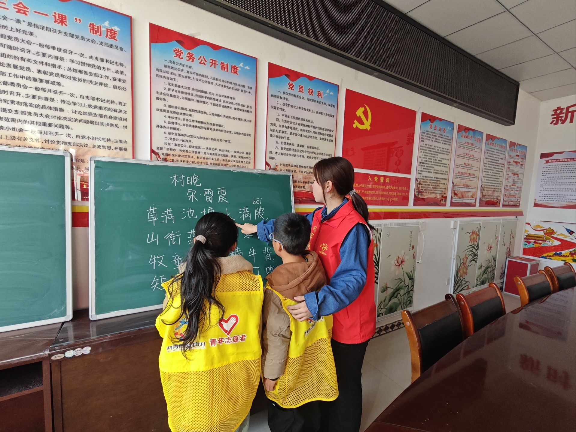 在学业辅导环节,实践团成员采用“一对一”“小组互助”的方式,为学生梳理知识体系、讲解重难点问题。针对语文科目,成员们从字词基础、古诗文赏析入手,帮助学生夯实语言功底;在数学教学中,通过例题拆解、思路引导,提升学生的逻辑思维与解题能力;英语课程则注重口语练习与词汇积累,鼓励学生大胆开口表达。图中,实践团成员正在为学生讲解古诗《村晚》,通过逐句解析、情境还原的方式,帮助学生理解诗歌内涵,掌握文言知识。