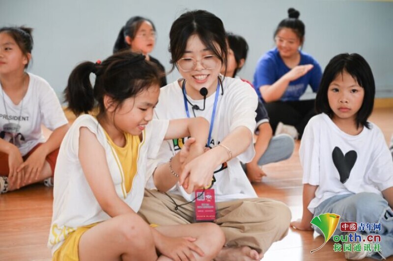图为支教队员给小朋友纠正动作。中国青年网通讯员 黄诗颖 摄
