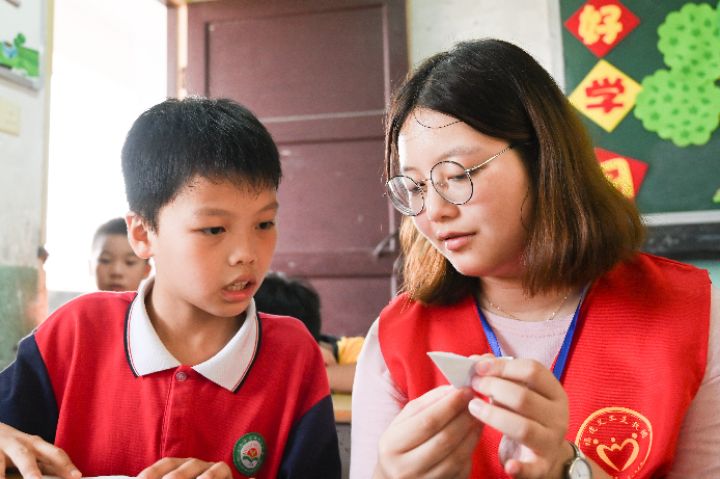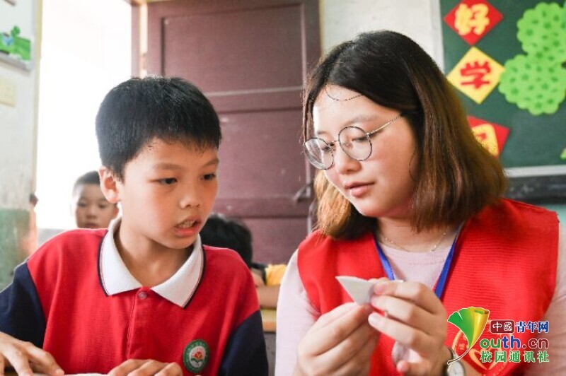图为支教队员课间教小朋友折纸。中国青年网通讯员 熊雨婷 摄