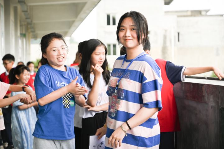 图为支教队员与小朋友们课间合影。中国青年网通讯员 黄诗颖 摄