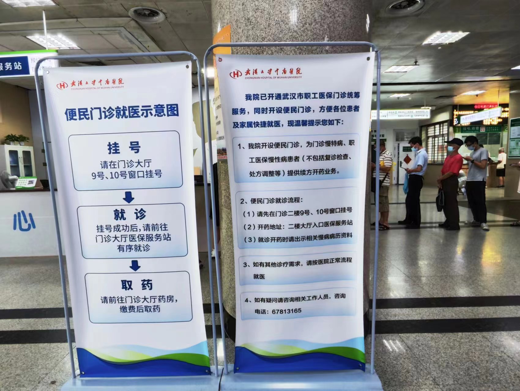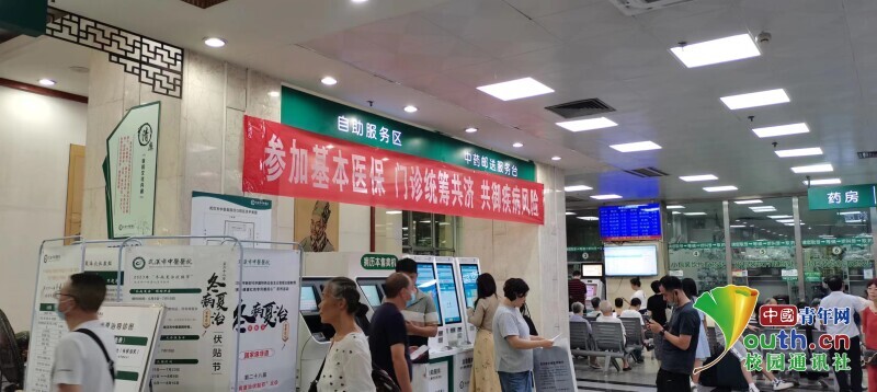 图为实践队员在武汉市中医医院拍摄的就诊大厅场景以及医保宣传横幅。中国青年网通讯员 张心蕊 供图