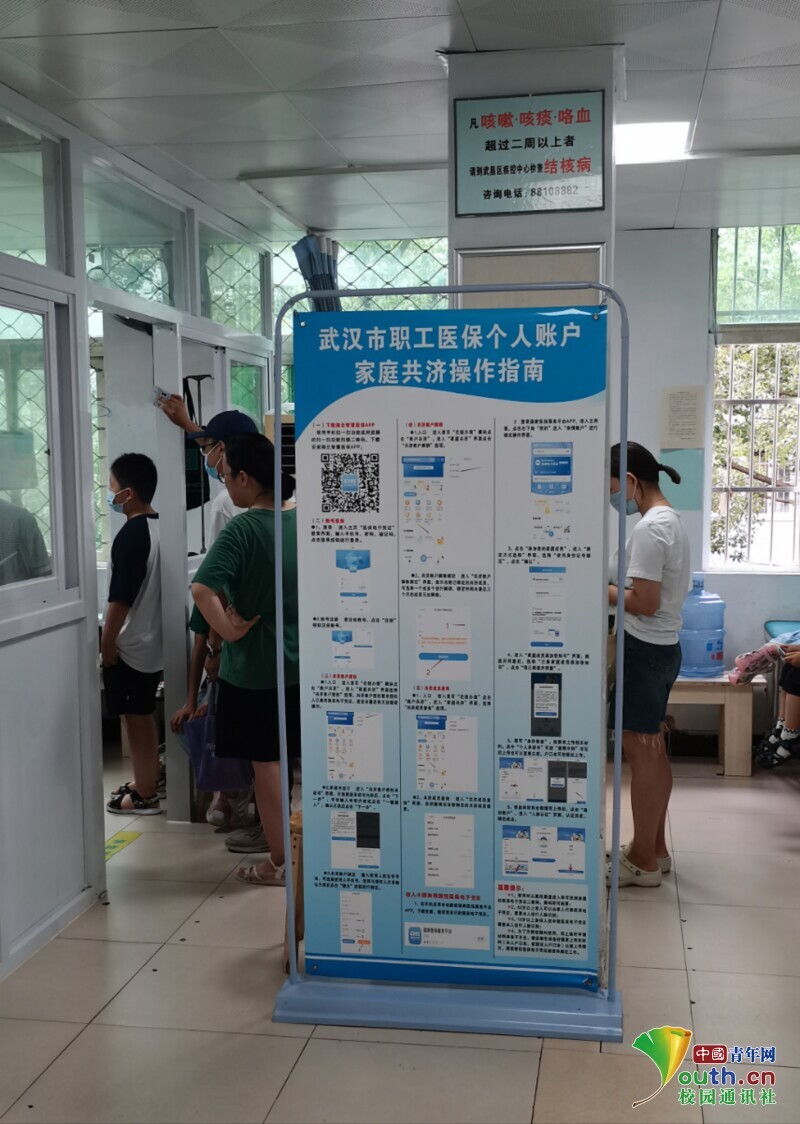 图为实践队员在武汉市某社区医院拍摄的就诊场景以及职工医保个人账户家庭共济操作指南。中国青年网通讯员 张心蕊 供图