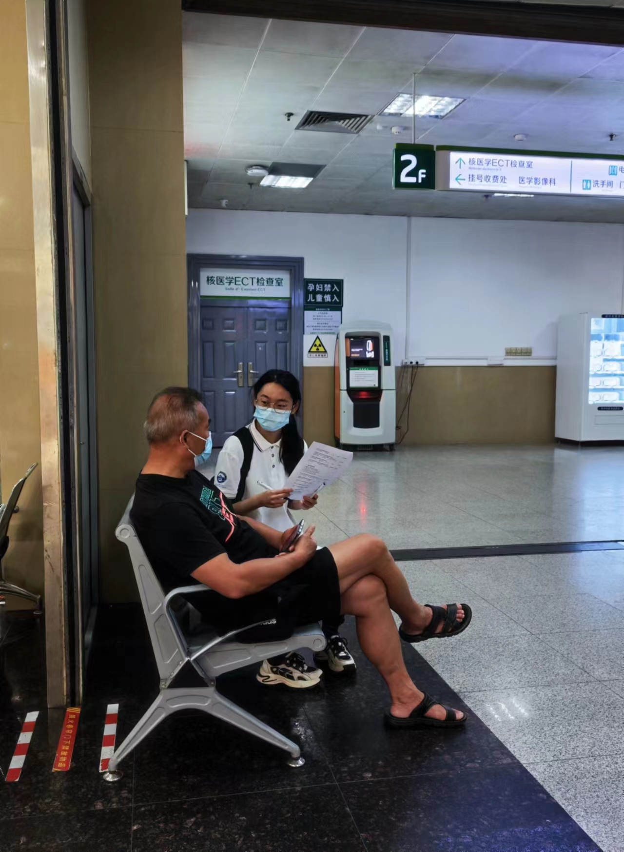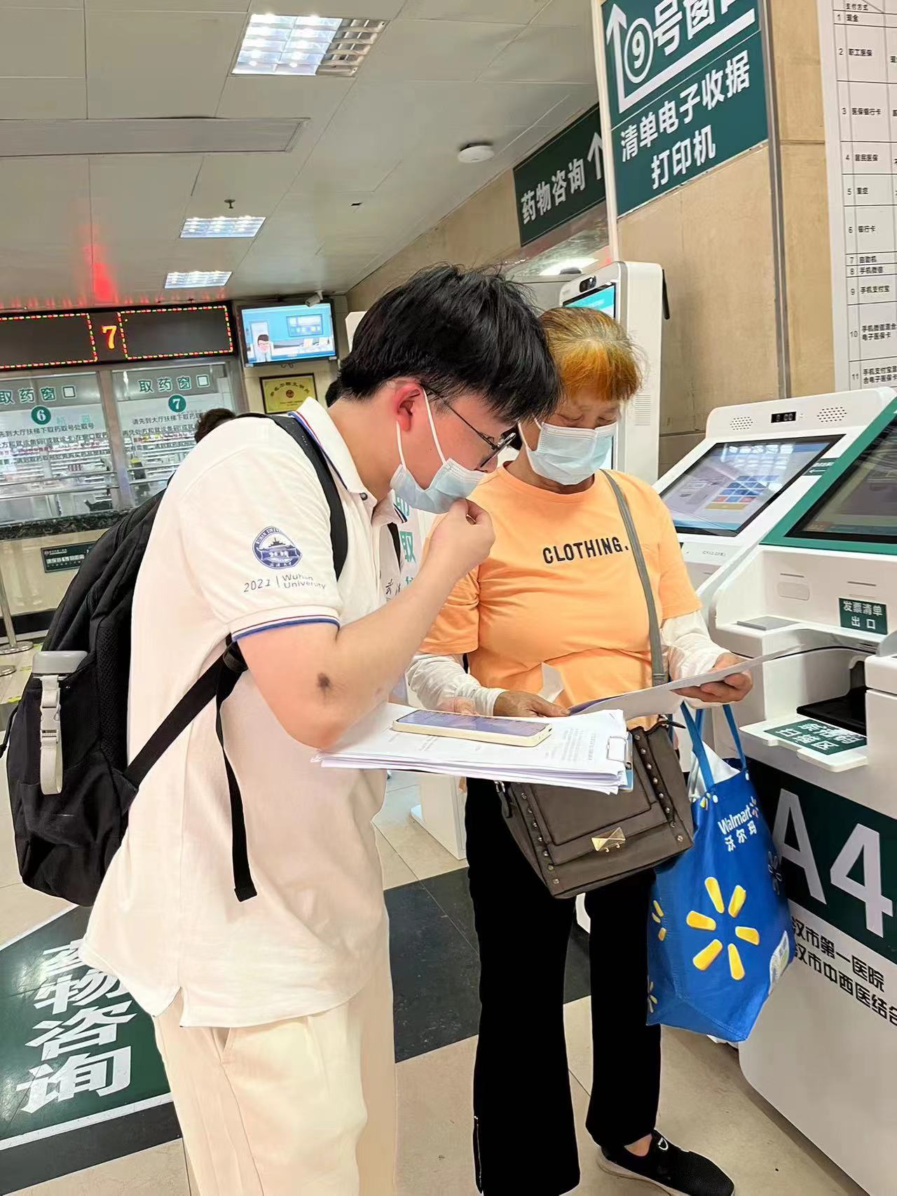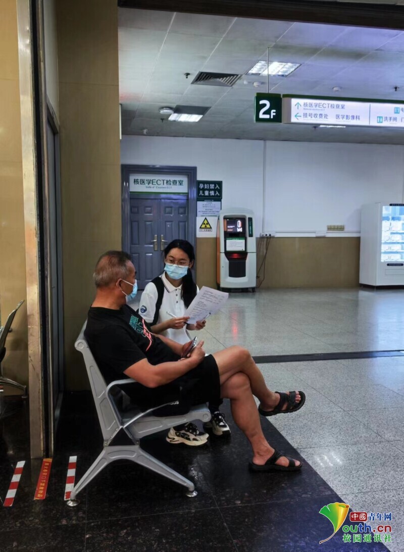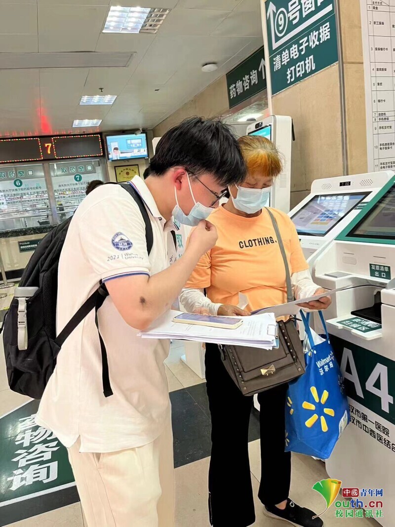 图为实践队员在武汉市第一医院与一名就诊患者进行问卷访谈并帮助其打印报告单。中国青年网通讯员 俱星怡 供图