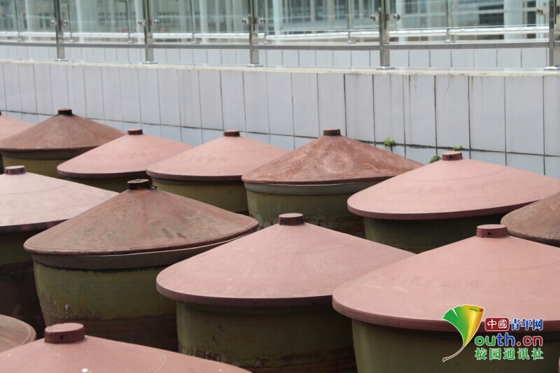 对于豆瓣生产的工艺而言,晾晒无疑是最为关键的环节。传统晒场仍沿用红缸盛装豆瓣,人工翻晒的工序,为保证豆瓣香味及色泽上的品质,坚持“朝晒夜露”的原则。团队成员虽未能亲身体验,但却可以想象出工人们顶着烈日,汗水浸透衣衫,不断用木棍翻晒的场景,感受那份匠人精神。 中国青年网通讯员 段松岐 摄