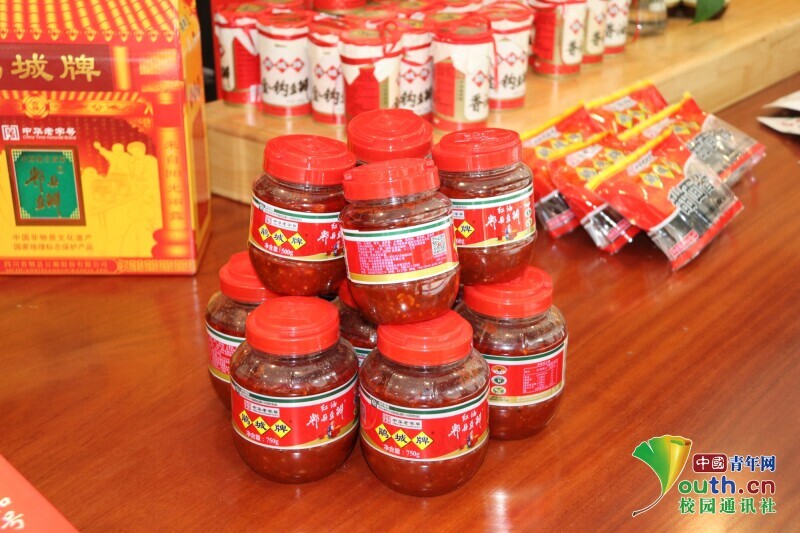 映入眼帘的是王牌产品—罐装红油豆瓣,它的色泽深红,香气四溢,能够清楚地看到其中的辣椒籽。这就是被称作正宗回锅肉所不可缺少的最佳伴侣。 中国青年网通讯员 段松岐 摄