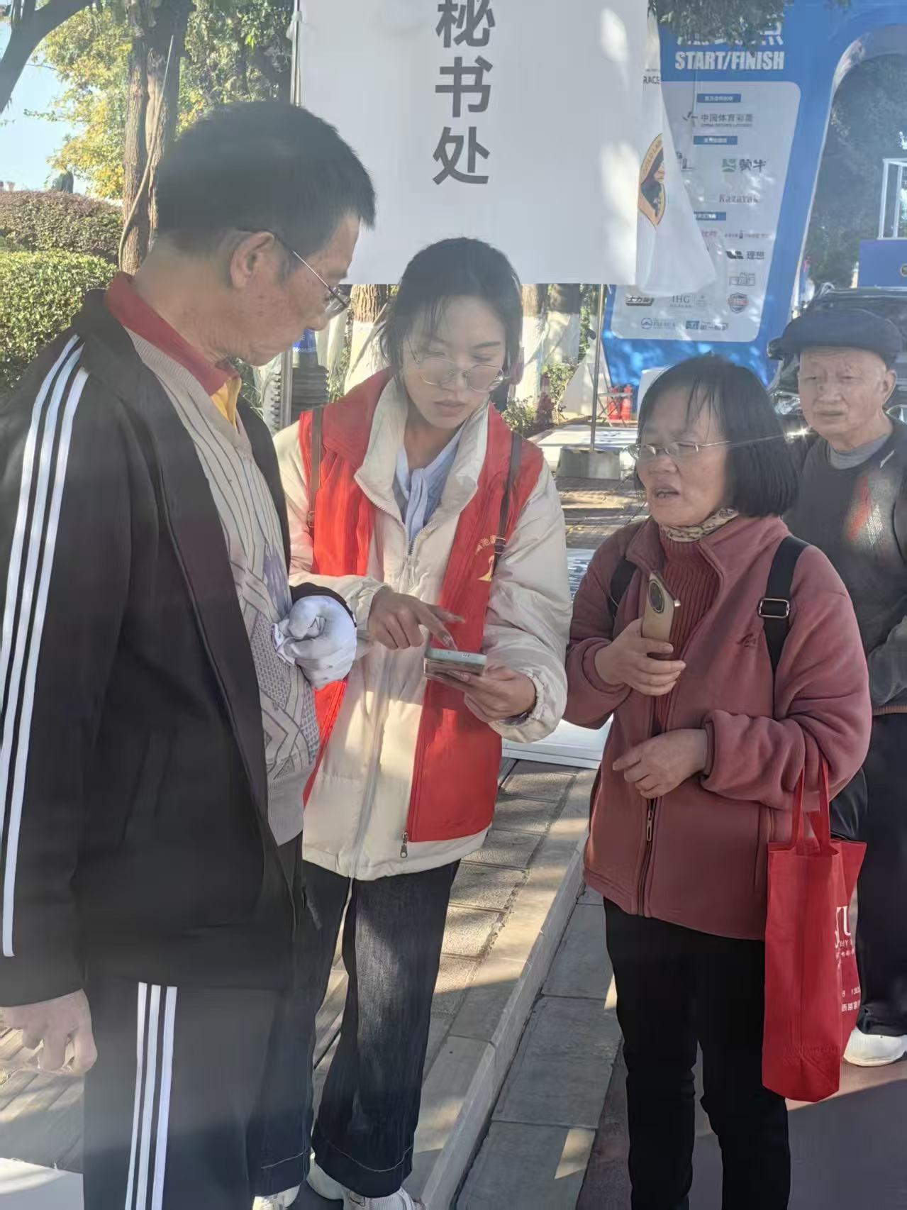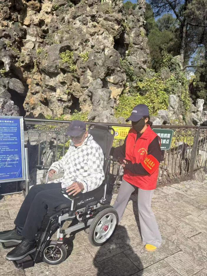 图为志愿者在协助老年游客前行游览。滇池学院 供图