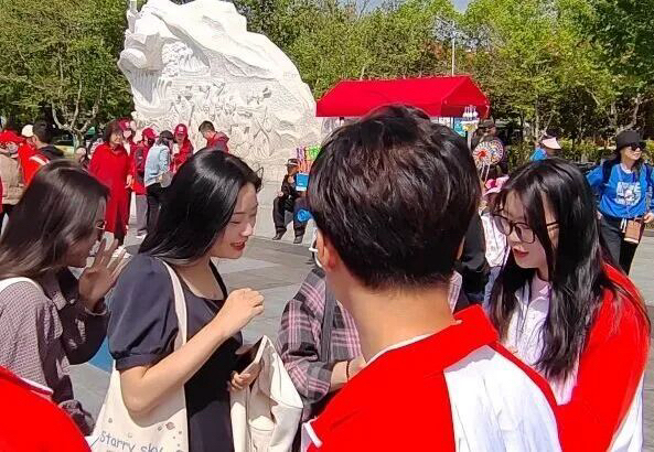 图为志愿者在为游客拍摄合影。滇池学院 供图