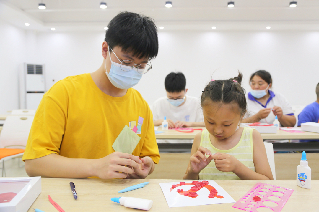 图为团队青年志愿者何俊杰为青少年讲解红色主题衍纸画制作要领。 中国青年网通讯员 许景惠 摄