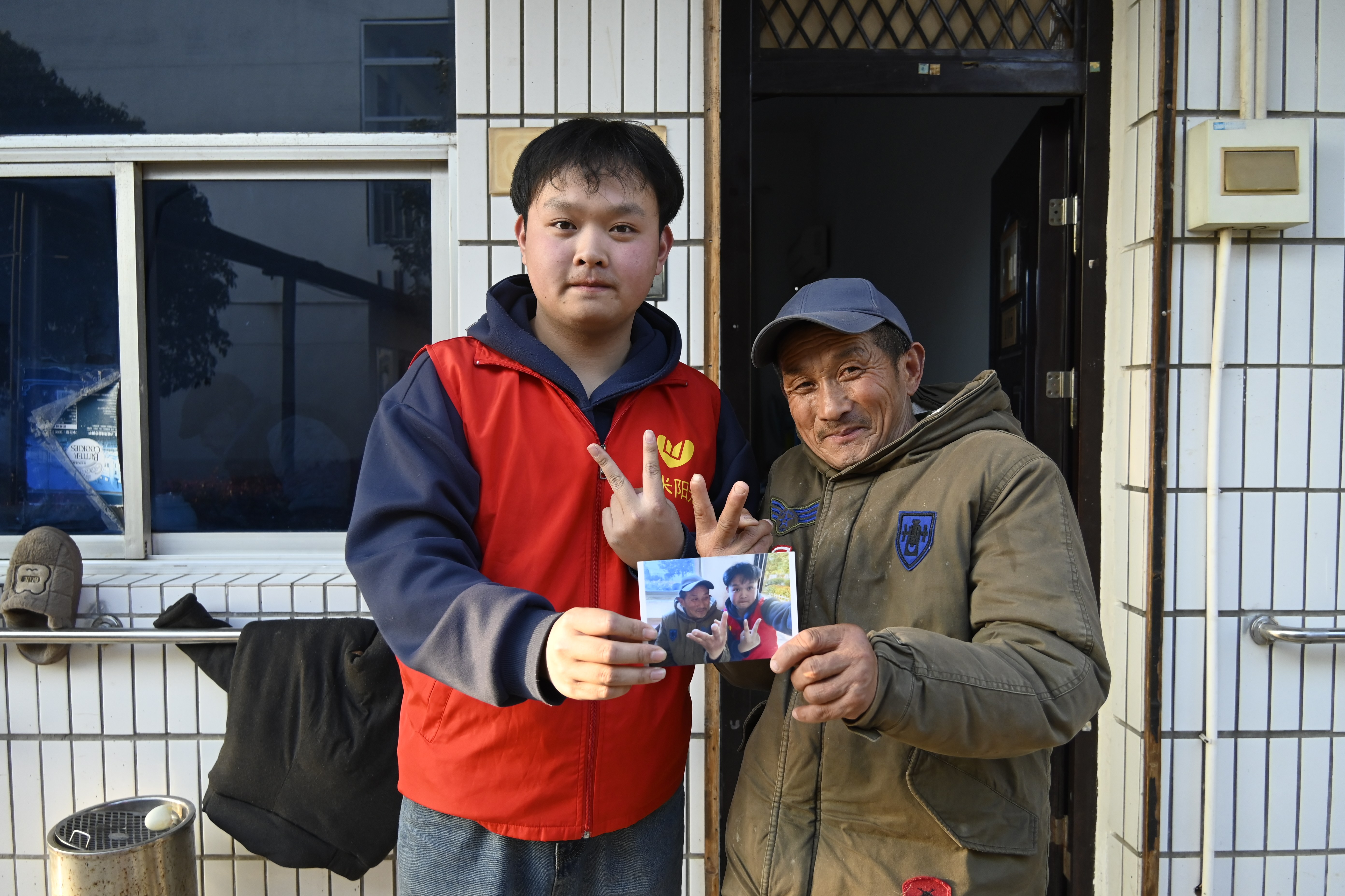 图为志愿者与老人手持“最美夕阳照”合影留念 。李文豪 供图
