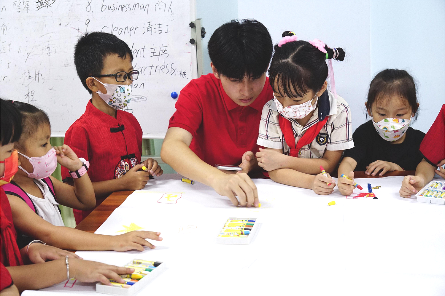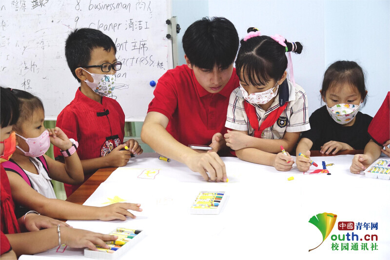 图为志愿者与小朋友们共同完成绘画。中国青年网通讯员 黄诗洋 摄