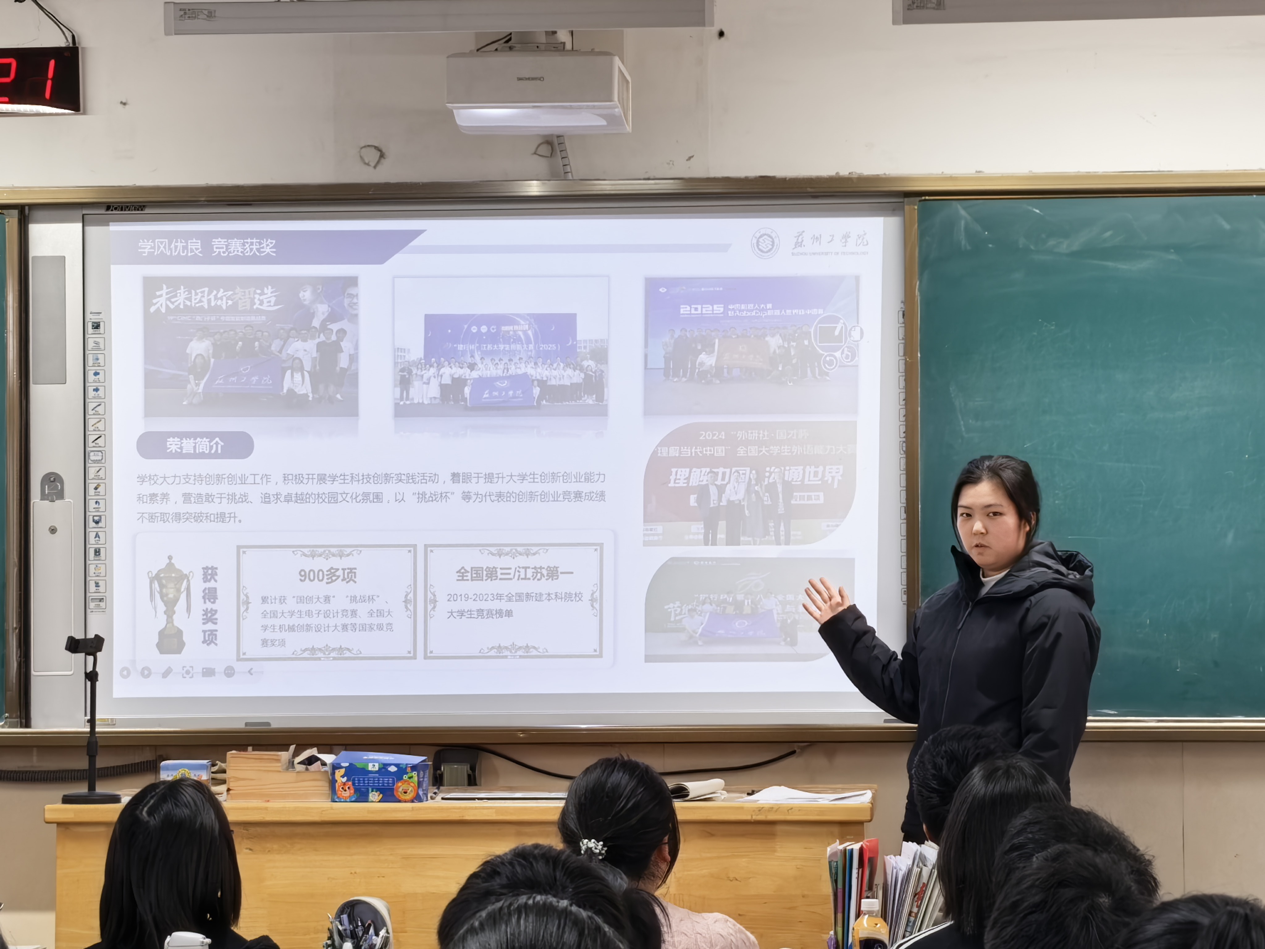 图为团队成员介绍苏州工学院竞赛优势及获奖情况。沈佳蕊 供图