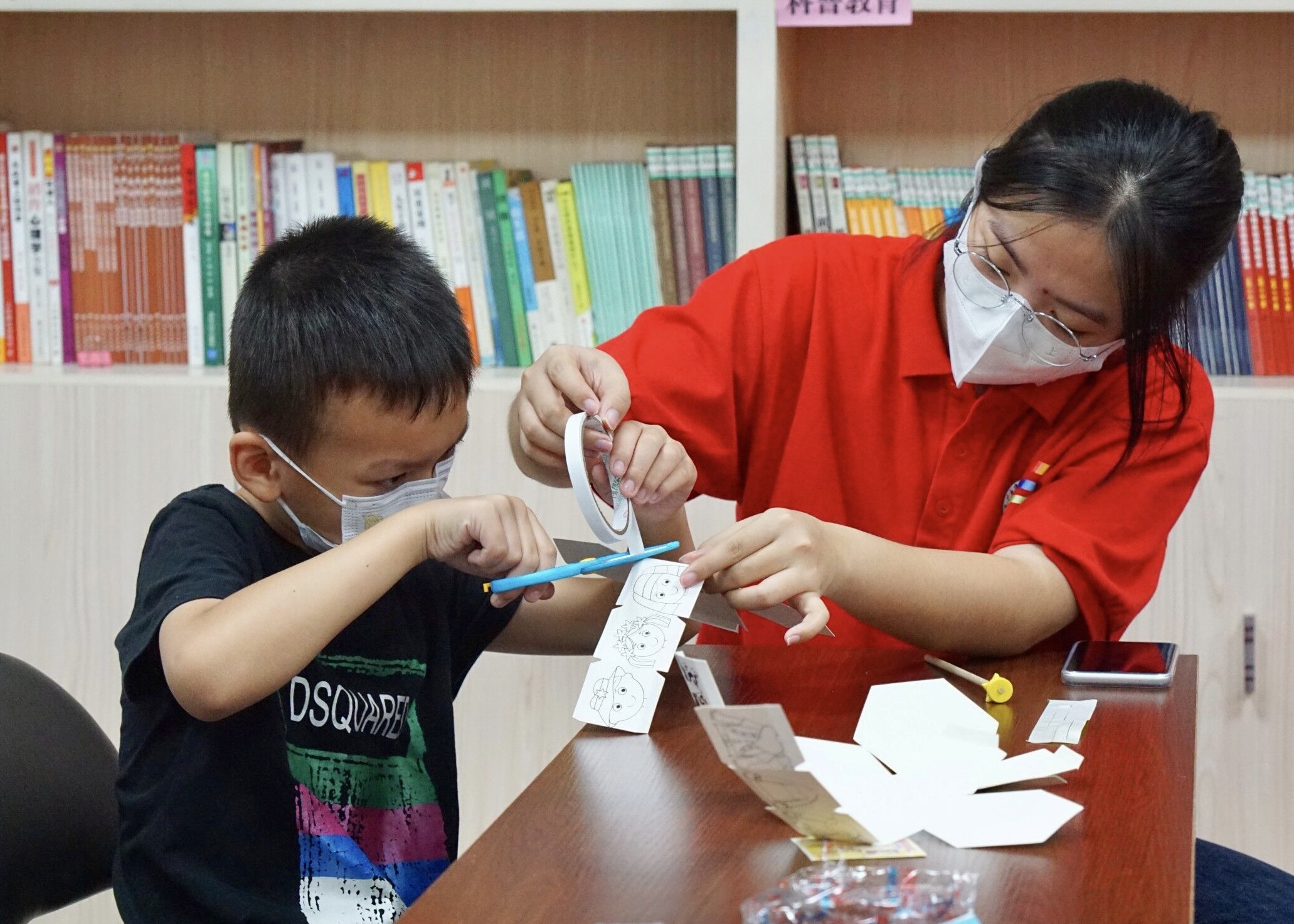 图为志愿者帮助小朋友制作民族服饰手工转筒。中国青年网通讯员 黄诗洋摄