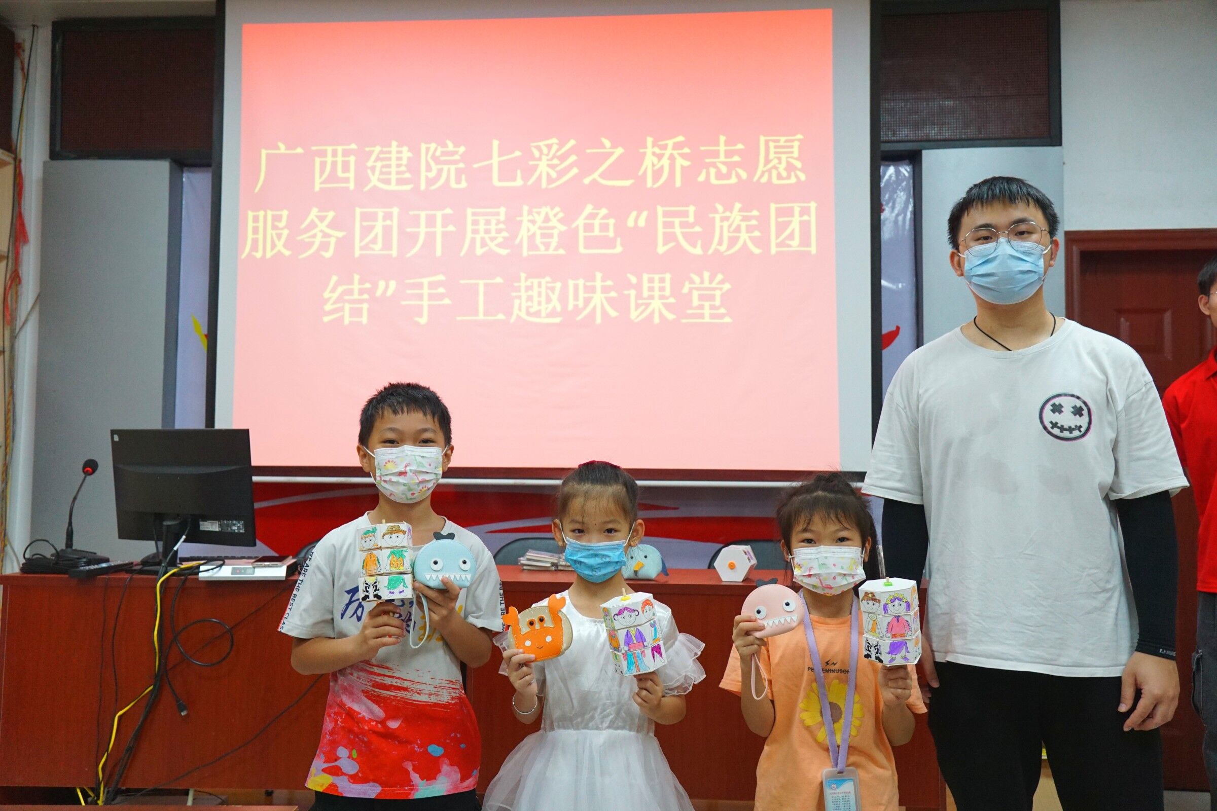 志愿者通过宣讲民族文化知识、教唱民族音乐、制作民族团结主题手工作品、开展知识有奖问答活动等方式,将知识课堂、手工课堂与团辅活动相结合,向在场的小朋友们普及各民族文化小知识,使民族团结教育小课堂变得生动有趣。