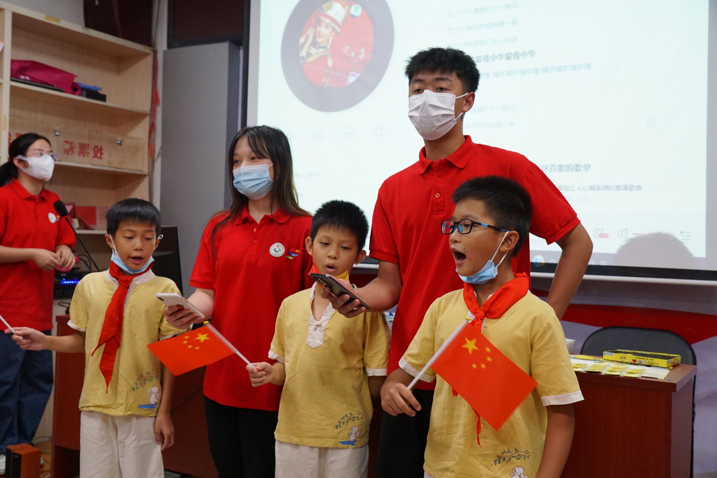 图为小朋友们在志愿者的带领下演唱《爱我中华》。中国青年网通讯员 黄诗洋摄