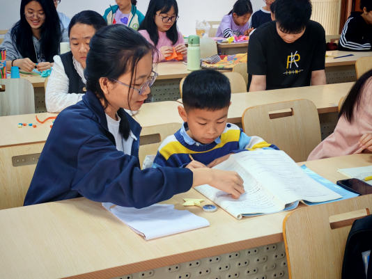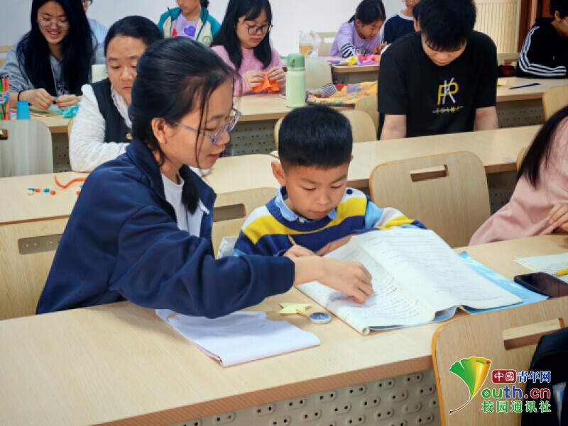 活动采用 “室内辅导+PPT展示三月三节日传统文化习俗+对山歌+三月三元素手工创作”多元形式。活动伊始,志愿者带孩子们走进温馨的室内场地,开启知识之旅。在室内辅导环节,青协分会工作人员组织志愿者针对小朋友们制定个性化“一对一”学业辅导方案。志愿者根据小朋友们自身实际进行功课辅导,一同陪伴小朋友们高效完成课后作业。