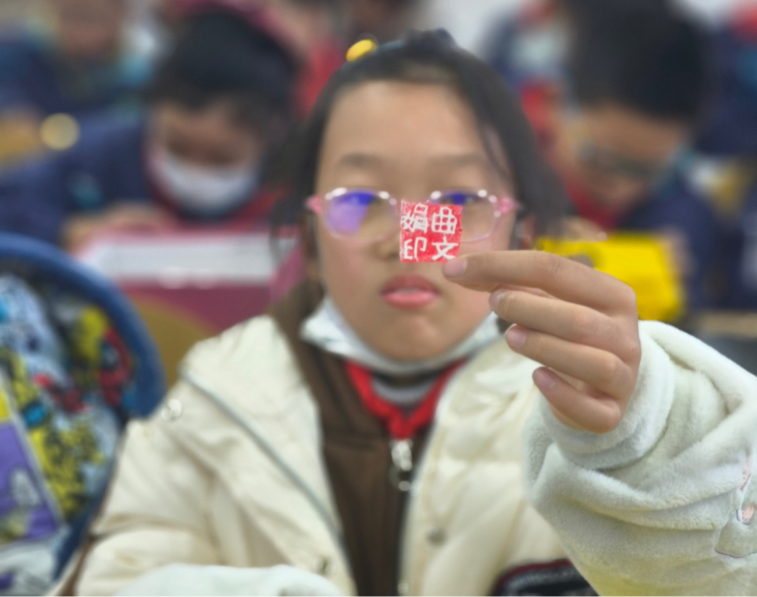 图为小学生进行篆刻作品展示。中国青年网通讯员 周嘉雯 供图