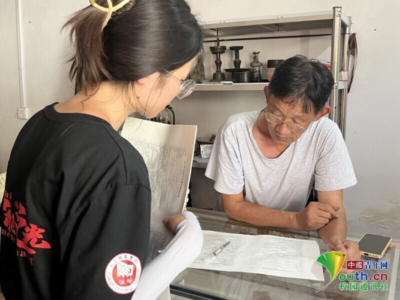 图为团队成员在一家书画社向当地的书法家了解文化传播情况。中国青年网通讯员 谢思荧 摄