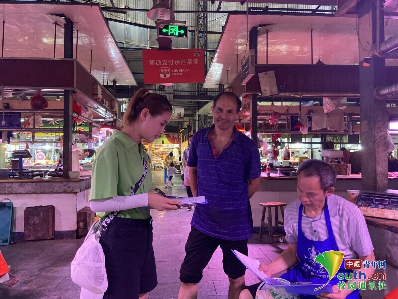 调研成员邀请菜市场员工填写纸质调查问卷。中国青年网通讯员 黎程 摄