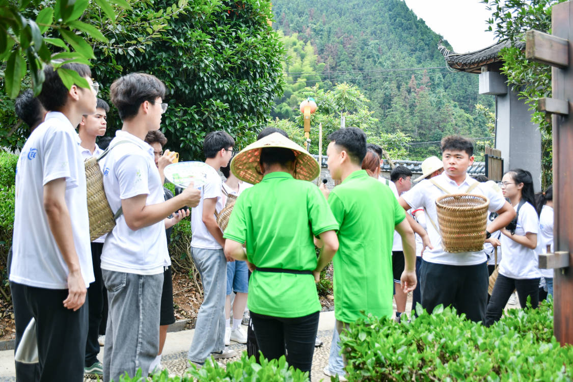 炎炎夏日,热情似火。活动伊始,实践团成员在专业人员的带领下走进茶园(又称“御茶园”),这是古楼茶文化生态园核心景区,因1385年古楼茶被明皇帝朱元璋钦定为贡茶而得名。“我们的绿茶采摘标准分为4个等级:第一个丹芽茶,我们称为贡茶,它采摘的标准非常高——只采牙尖。接下来就是“一芽一叶”,也就是我们今天要采摘的,这是精品茶的标准……”现场讲解使实践团成员深入了解茶的分类,走进绿色自然,感悟乡村振兴文化,为广大青年学子投入乡村振兴实践汲取初心力量。
