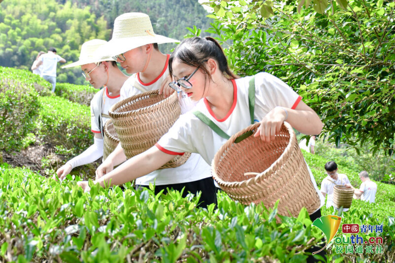 图为实践团成员在采茶。中国青年网通讯员 高裕 摄