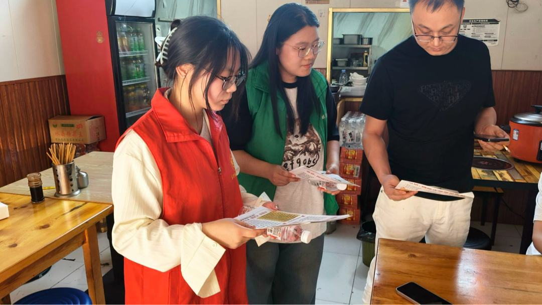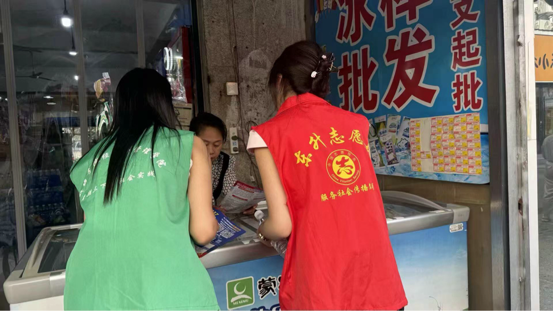 图为实践成员向商铺老板发放防诈宣传手册,普及金融知识。许愿 供图