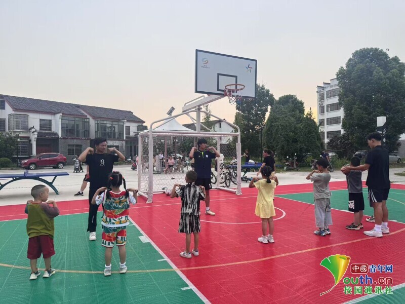 “运球时掌心要空,用指尖发力……”7月16日傍晚7点,董场村文化活动广场上,篮球培训课正火热进行。体育系学生志愿者颜嘉文一边示范动作,一边纠正孩子们的姿势。12岁的靖哲琳学得格外认真,汗水顺着脸颊滑落也顾不上擦:“以前只会瞎拍球,现在知道怎么投篮了,下次要参加村里的篮球赛!”