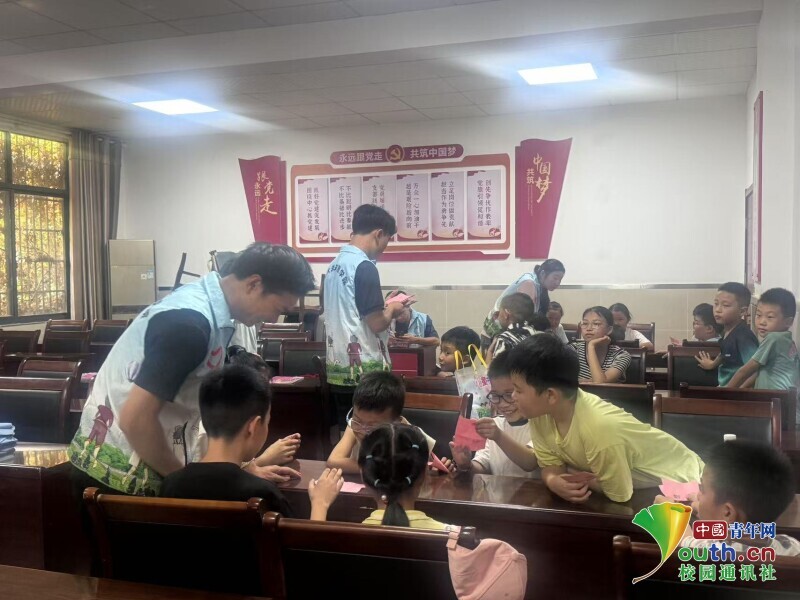 每天下午3点半,董场村委会活动中心里总会传来阵阵笑声。这里是实践团为留守儿童设立的“暑期托管驿站”,8名志愿者轮流值守,为20多名孩子打造了一个集学习、运动、娱乐于一体的“快乐空间”。