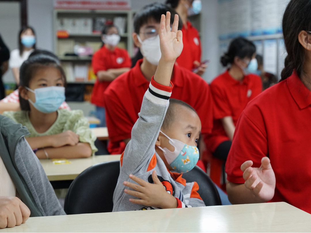 图为小朋友们在志愿者的带领下演唱《爱我中华》。中国青年网通讯员 黄诗洋 摄