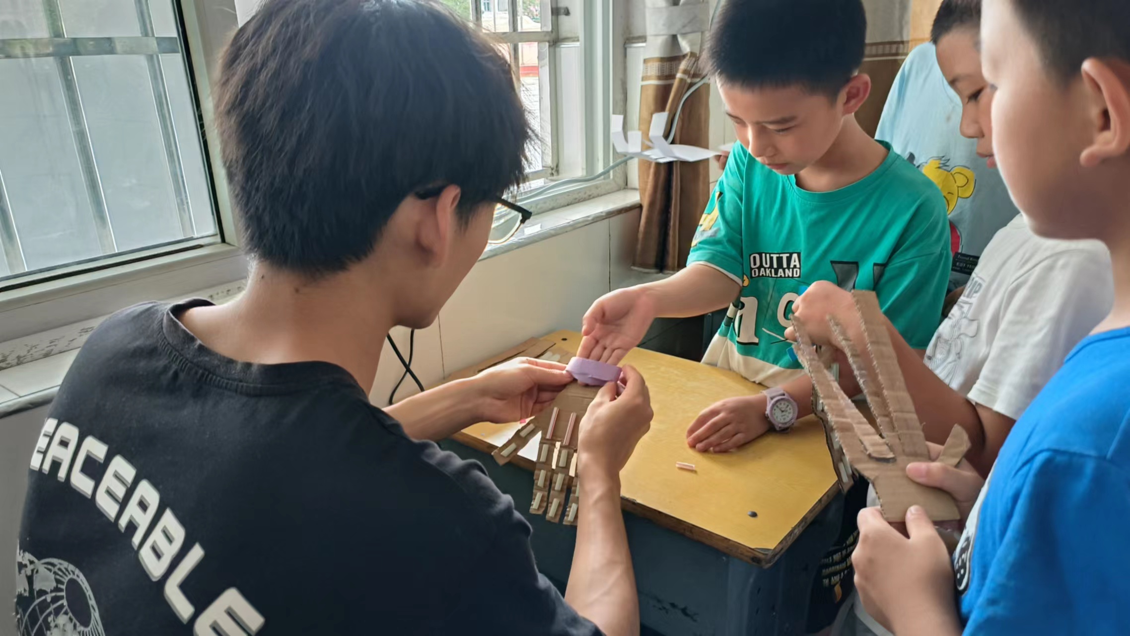 图为志愿者老师帮助学生完成机械手的制作。 中国青年网通讯员 柴林鑫 供图