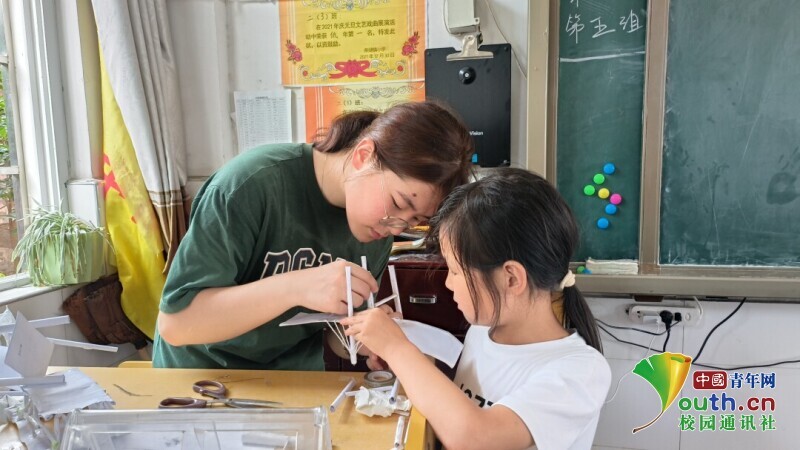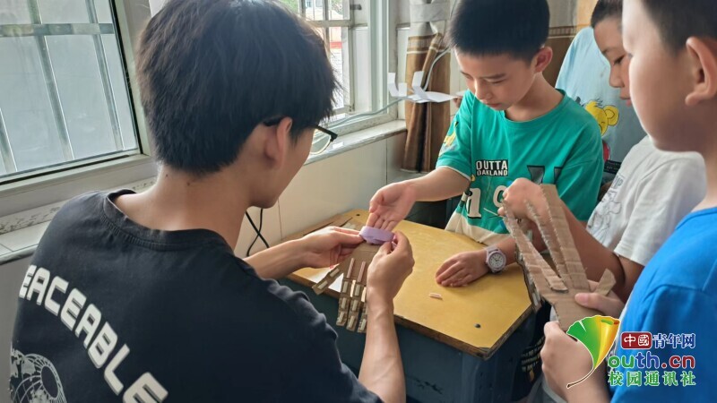图为志愿者老师帮助学生完成纸桥作品的制作。 中国青年网通讯员 柴林鑫 供图
