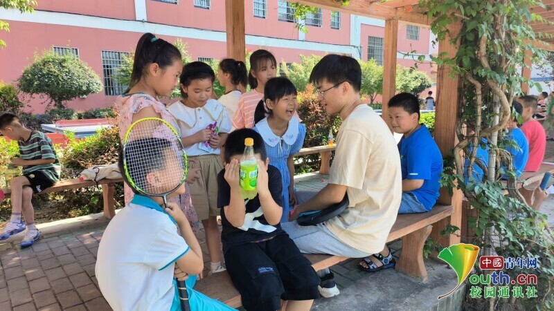 图为羽毛球课间志愿者老师与学生轻松融洽地交谈。中国青年网通讯员 柴林鑫 供图