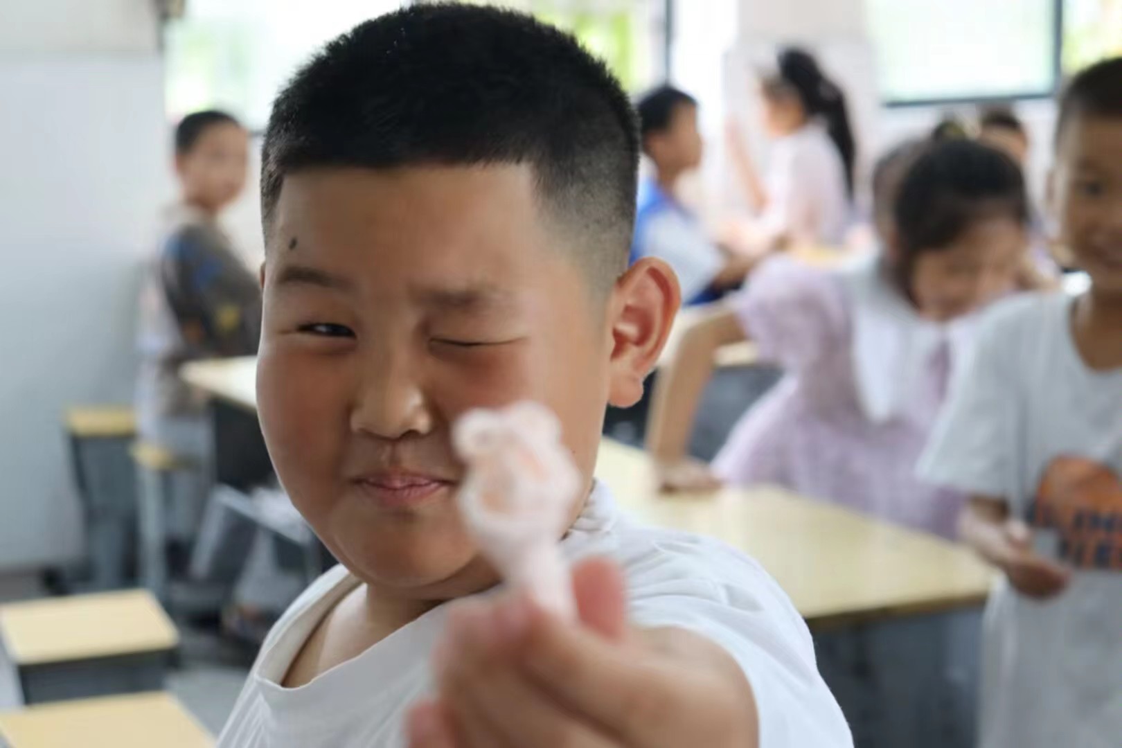 图为学生向老师积极展示他的手工作品。 中国青年网通讯员 龚丽瑾 供图