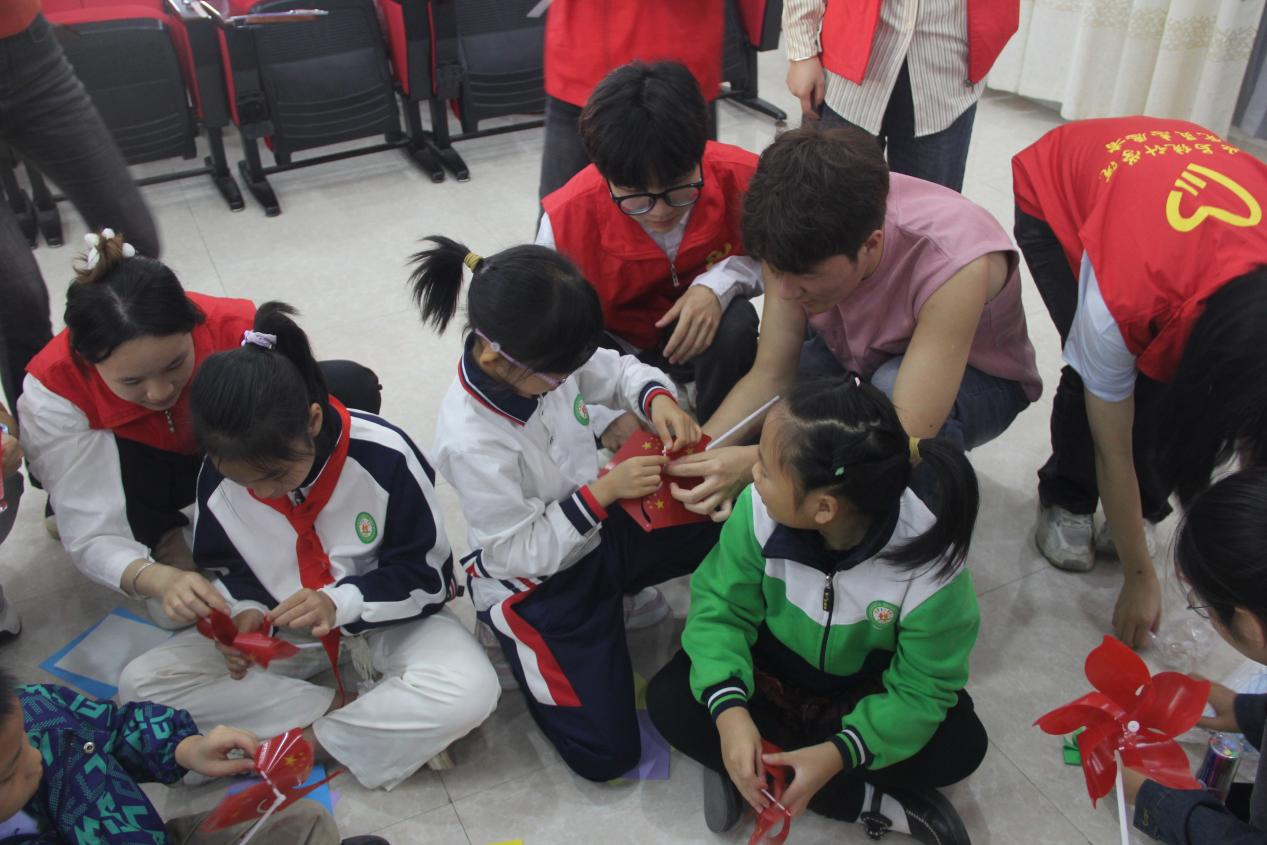 “红数林”文化体验营以“数”记党史、趣味手工传承红色基因,感受传统文化魅力。一场形式活泼、趣味十足的“红数林”文化体验营在同学们的欢声笑语中拉开序幕。紧张有趣的党史速记游戏,让同学们脑洞大开、集思广益,纷纷加入智力和脑力的比拼中去。大学生志愿者同中小学朋友们一起做红色风车、折纸小鱼、青蛙、兔子、千纸鹤等传统文化手工作品,锻炼孩子们的动手能力,激发创造力和想象力,培养审美情趣,增强专注力与耐心,提升解决问题的能力。简单的纸张,在他们的指尖下,经过巧妙折叠、翻转,变成一个个精美的艺术品,为校园文化注入一股浓郁的传统韵味。
