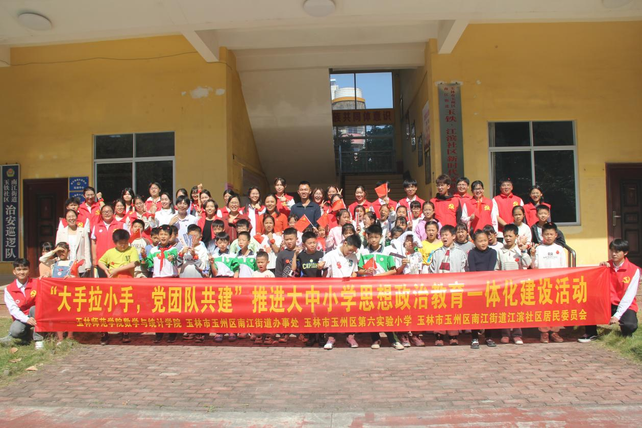 11月8日,玉林师范学院数学与统计学院联合玉林市玉州区南江街道办事处、玉林市玉州区第六实验小学、玉林市玉州区南江街道江滨社区居民委员会开展“大手拉小手,党团队共建”推进大中小学思想政治教育一体化建设活动。活动坚持“又红又专”底色,秉承有“知”有“味”原则,开展系列“党味浓、学味足、趣味多”+“思想紧、形式活、效果实”的党团队共建活动,提供了一份丰富的“红数林”文化大餐,构建多方协同育人机制,推动思想政治教育内涵式发展。
