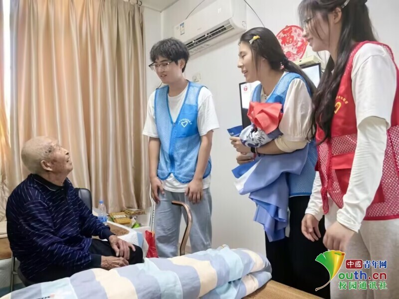 实践队探望了村中一位九十岁的抗美援朝老兵。“1952年冬天最冷的时候,我们在长津湖潜伏,一把炒面一把雪,但为了国家,啥也不怕...”老人向围坐的学子们讲述道。