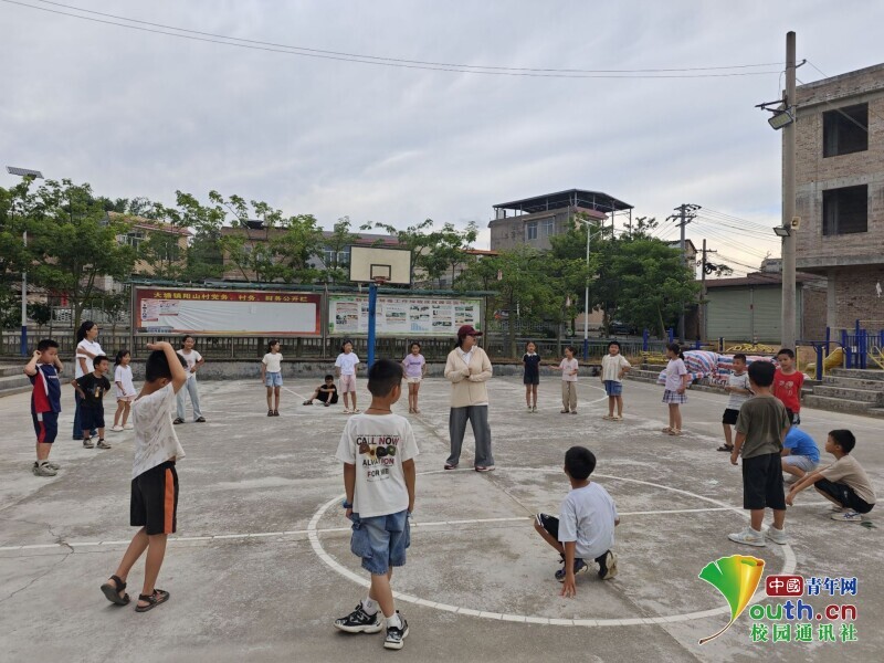 图为服务团成员在操场与孩子们进行趣味活动。陈亭 供图