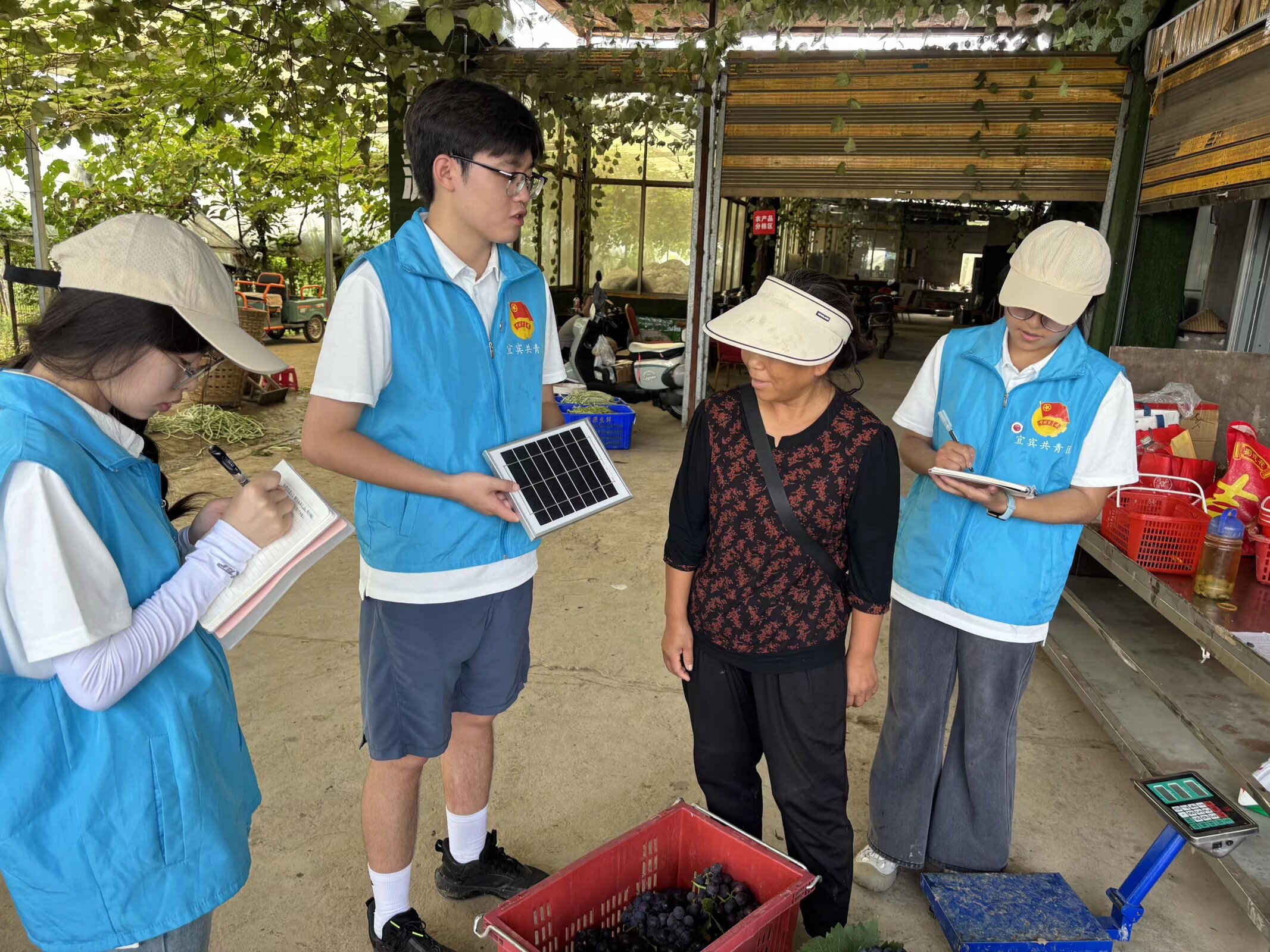 图为队员向葡萄园负责人科普对光伏板的日常维护。彭郑瑞 供图