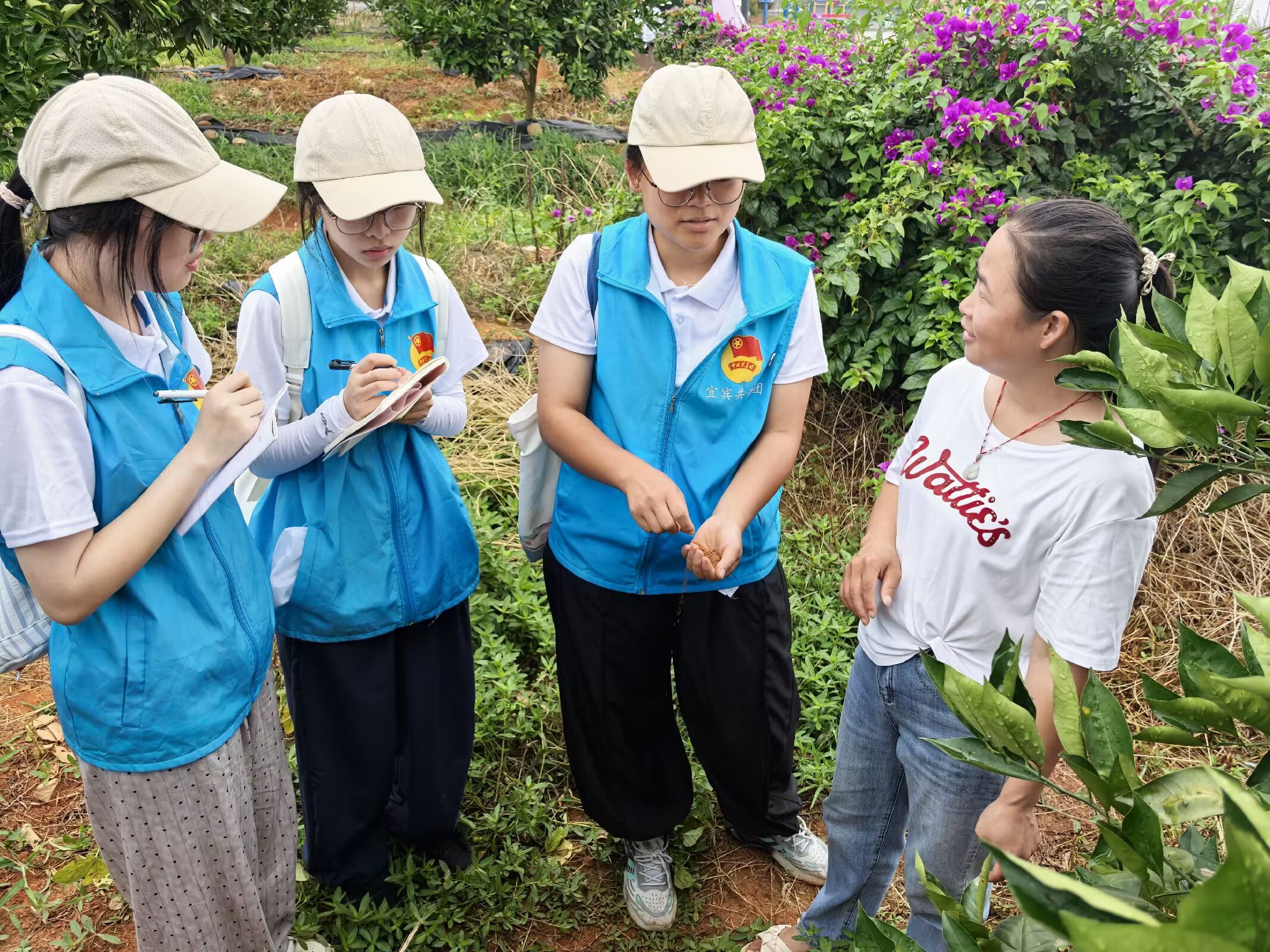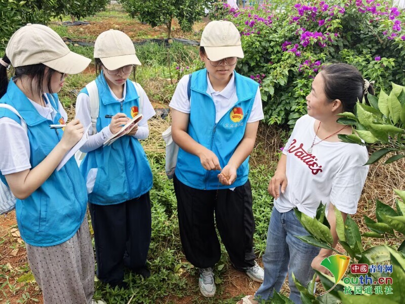 图为实践队员通过土壤为园区负责人讲解果树所缺元素。彭郑瑞 供图