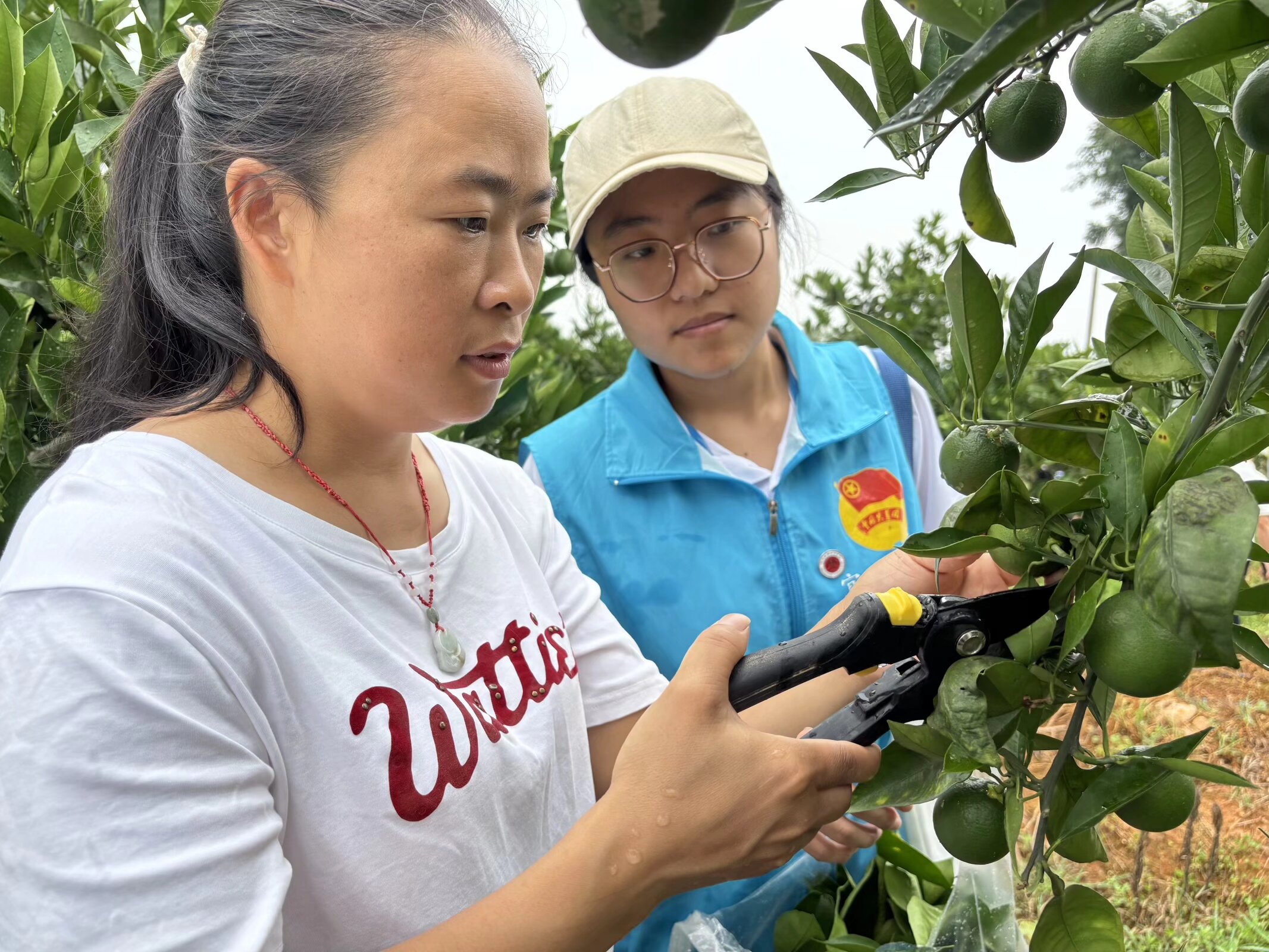 图为实践队员与江南镇塔罗科血橙基地负责人剪除病枝。彭郑瑞 供图